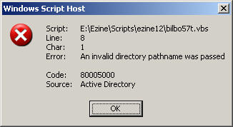 When you execute the script you get a WSH message box like this (See diagram). The VBScript does execute as you hoped. One possibility is that you are using an LDAP object which has been misspelled. Another cause could be missing speech marks in a value.